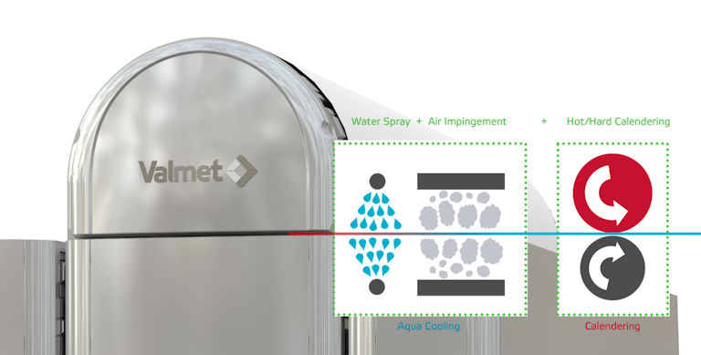 维美德最新的体积节省解决方案是Aqua冷却压延。与通常的生产条件相比,这项新的专利技术提高了压延结果。使用传统的轧辊夹紧,最好的压延结果时,网是凉爽和僵硬,就像在试点试验。使用Aqua冷却压延技术,通过在压延夹紧前冷却腹板,将试验条件提高到生产水平。