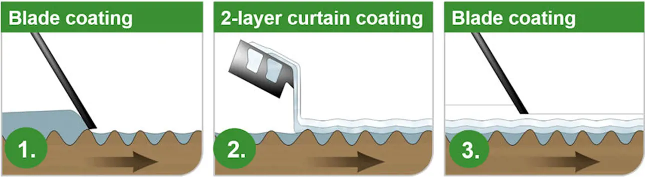不同的涂层应用方法适用于不同的目的。有时你需要不止一个涂料层应用与多个涂料类型的涂层达到最优结果。在下图中可以看到两种不同的涂层方法的不同种类的好处:窗帘叶片涂层和涂层。叶片涂层提高平滑和窗帘涂层提高涂层覆盖——他们一起delvier完美无暇的涂料质量!