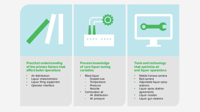 锅炉调整可以使回收锅炉更有效地运行。回收锅炉运行的关键工艺部件是燃烧空气系统和黑液。经验丰富的服务工程师可以对锅炉运行进行微小的改变,以优化效率。目的是提高减灰效率,降低排放,降低灰带,减少锅炉堵塞。