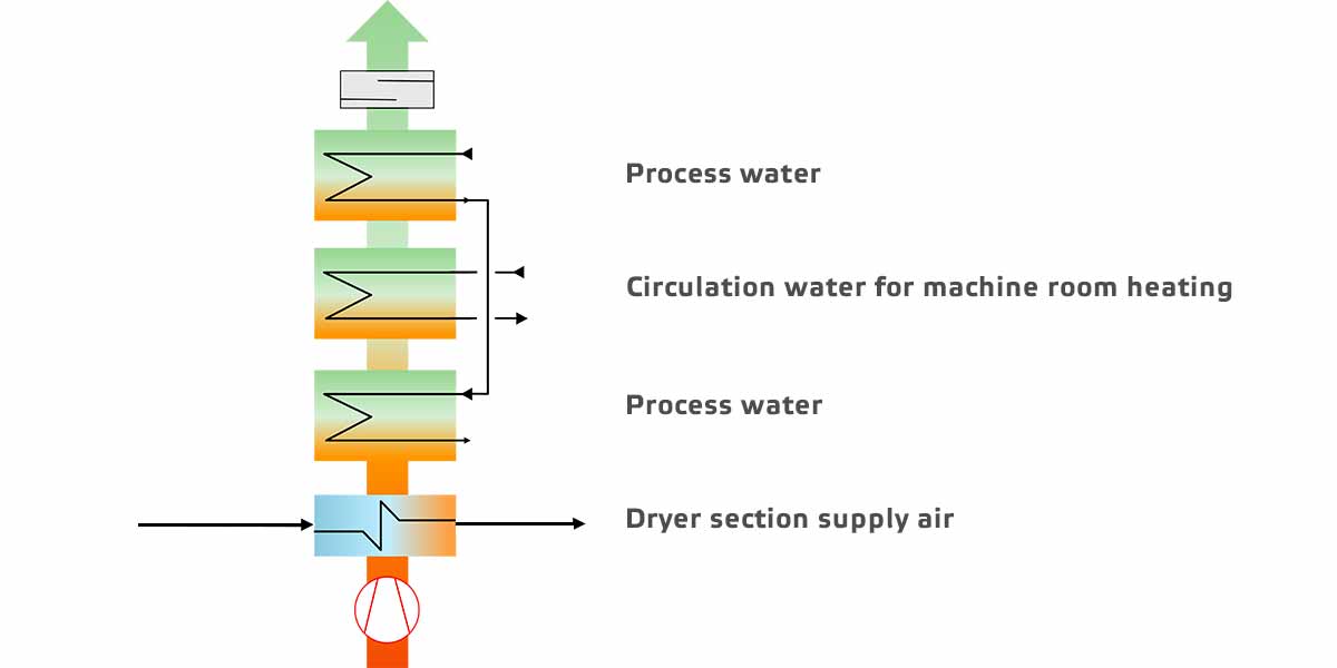 干燥器部分是最大的消费者在造纸机的热能。作为几乎所有多余的能量离开干燥器与发动机排气部分,这是一个优秀的热源。热回收提供了可观的节能,热回收投资的回报时间通常不超过一年。