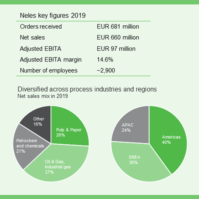 Neles是全球领先的阀门,阀门自动化和服务公司,具有强烈暴露于纸浆和造纸工业。大约70%的Neles净销售额是经常性的业务。NELES的业务在流行行业和地区有多样化,来自纸浆和造纸业的26%的净销售额。自2011年以来,收到的NELES的订单每年增长约5%,盈利能力得到了改善。