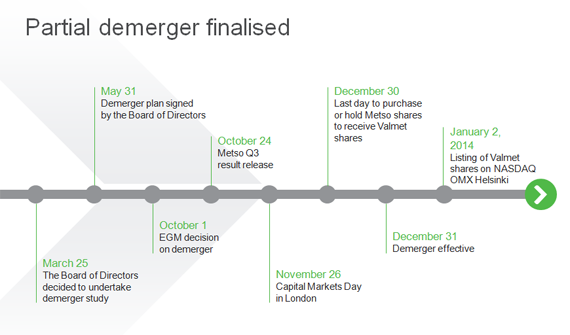 的完成分是12月31日在芬兰商业登记注册日期2013年,也当瓦尔麦特公司的合并变得有效。美卓的股东收到分来考虑一个(1)分享瓦尔麦特公司每股拥有在美卓。没有分考虑发行的由美卓的股票。