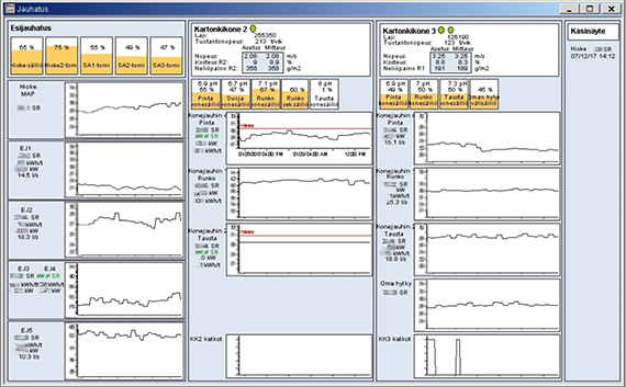 Valmet MAPアナラ▪▪ザ▪▪は2017年4月に設置された。合計12台の自動サンプラーを搭載しており,上部および後部パイルについて,プレリファイナー,マシンリファイナー後,および,中間層リファイナー,強化パルプリファイナー,ブロークパルプリファイナー,砕木パルプリファイナー後に両マシン上の濾水性を測定する。アナラ▪▪ザ▪▪はサンプルを自動的に循環させ,約1▪▪時間で全12▪▪ントの連続測定更新を提供する。Hankaniemi氏は次のように述べている。“当社は,真夏までの最初の2ヶ月間に,15の異なるパルプグレードと混合物を使って概略的に実験室で相関関係を調査しました。その結果が非常に良好であったため,更なる確認は必要がなくなりました。」両方のマシン制御室の専用ディスプレイに、12の測定ポイントの毎時濾水性値がトレンド形式で表示される。「オペレータは何が起こっているかを正確に知り、制御操作の結果をほぼ即座に確認することができます。以前は、変更が行われたのか、それがどのような影響を与えたのかを知ることは困難でした。」と Hankaniemi氏は述べる。オペレータはトレンド情報を積極的に使用してリファイナーエネルギーを調整する。特にディスプレイ上の赤色ラインで表示される BM2に対する濾水性限界により簡単に行えるようになった。「まだまだ新しいことですが、当社は BM2の上部および後部パイルに対する濾水性限界を決定し、オペレータはそれらがどこにあるかを正確に把握することができます。過度の水分による破損は減少しましたが、それでもなお発生することがあります。しかし、原因をより正確に判断することができるようになりました。」