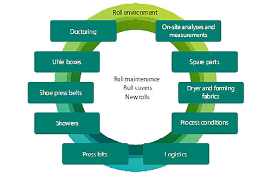 在新的360°滚转方法中,滚转维护考虑到整个滚转环境。如果与卷筒相关的所有因素都能很好地结合在一起,那么造纸过程就能以最好的方式进行。