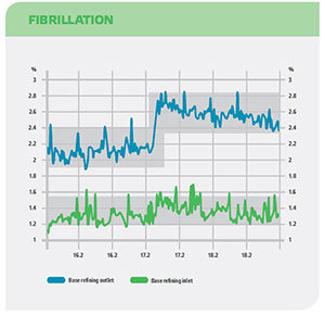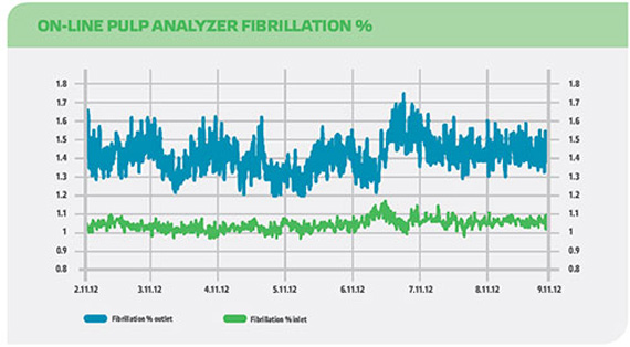 在线测量已被证明对精炼条件的变化有响应,并显示纤颤的趋势和显著的可变性,这将转化为薄板强度的变化。这种变化可能来自于正常精炼条件的变化,包括精炼板磨损、稠度变化和pH等化学因素。