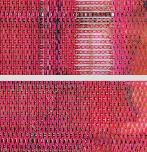 维美德烘干机织物或的两个独立的纱线系统保持织物运行明显更长的时间。虽然机器侧条纹磨损(上图),床单侧保持完整(下图)。