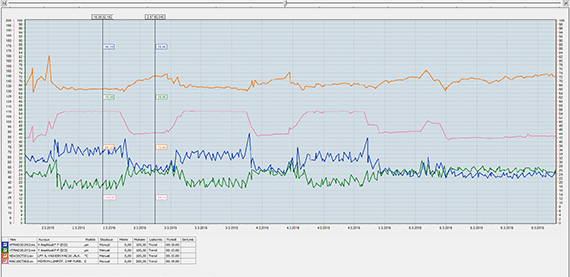 图1。综合状态监测使工厂人员可以轻松地比较过程数据与振动。在这里,可以很容易地看到蒸汽温度和轴承温度(上两条曲线)对区域热泵轴承振动的影响。
