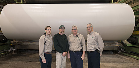 欧文纸业满意的工厂员工:Justin Charron PM 1(技术助理,左起),Bill Davis(操作员),Greg Ryan (PM 1主管)和Mark Chatterton(运营经理)。