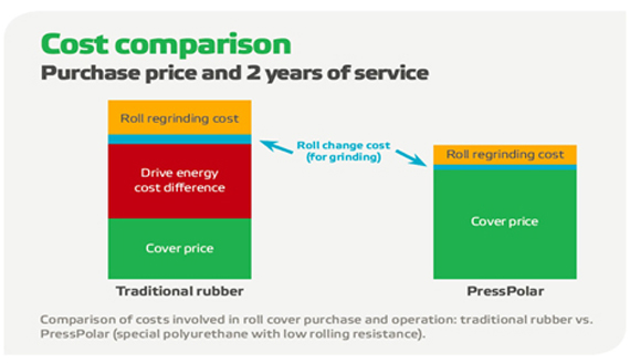 在比较盖板购买价格和再磨需求时,轧辊盖板的滚动阻力及其对驱动能量的影响起着重要的作用,特别是在纸板机使用的高负荷压辊中。压辊保护层PP的回收成本较高,但驱动能源的减少通常意味着在1-1.5年的运行后,这些费用已经回收。