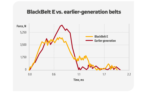 该测试显示各种带材料和结构之间的显着差异。具有最低测量力的样品保持完整,而具有更高测量力的样品在样品的一侧或两侧显示出裂缝。在测试期间,一些样品甚至在两个中爆发。这黑带E.(E为极端)与其他几个带设计相比,相比表现出优异的抗冲击性。在整个皮带的一生中似乎似乎保持一致。