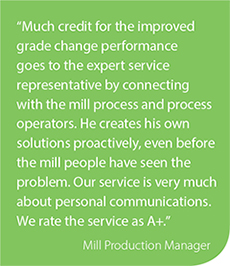 自2007年QCS启动以来,该轧机专注于等级变化性能作为持续系统性能的关键指标。2007/2008年,1.7%的产量在等级变革期间被拒绝丢失;现在,这是2013年10月的1.0%(改进40%),而且为0.9%。根据生产经理,通过与Mill Process和Process Operator联系,通过与Mill Process和Process Operator联系,提供了许多信用代表。制作经理表示,即使在磨坊人看到这个问题之前,他也会积极创建自己的解决方案。“我们的服务非常有关个人通信。我们为+ +评分服务,“他补充道。