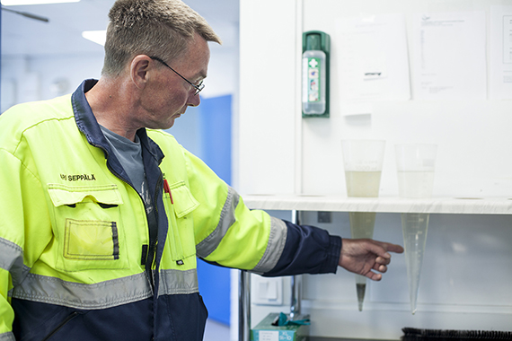 ARISeppälä,工艺操作员,指向清洁废水样品,这些样品已经在未治疗的废水样品旁边处理