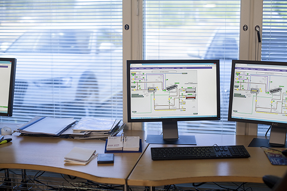 (左)与Valmet DNA的控制室过程自动化系统。(正确的)AriSeppälä在控制室监测污泥脱水过程