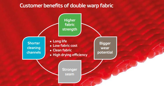 “例如,我们的新Valmet干衣机DG面料有一个相对开放的片材侧面,以防止纱线节之间的污垢结块,而机器一侧是光滑的,以获得良好的片材可操作性。其独特的编织图案设计,通过安排纬纱,使反织物运行方向的水射流通过织物,提高高压清洗效果。维美德干衣机DG面料与其他维美德干衣机面料相同,采用双经纱结构和耐用的经纱环缝,以保证长寿命和低面料成本。”