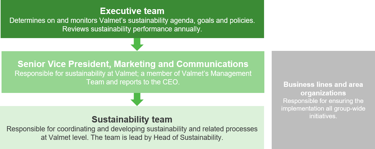 维美德的执行团队决定并监督维美德的可持续发展议程和目标以及所有相关政策。维美德的可持续发展绩效每年由执行团队进行审查。维美德的营销和传播高级副总裁负责维美德的可持续发展;她是Valmet管理团队的成员,并向首席执行官报告。