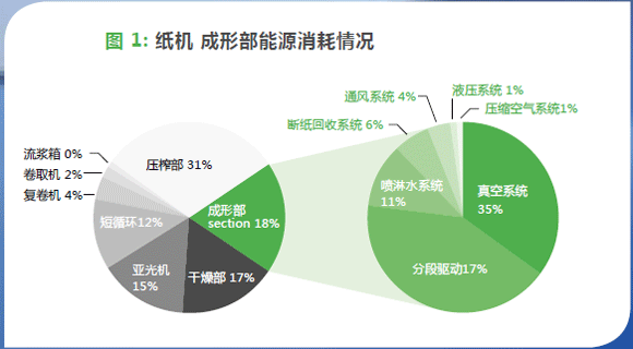 第二个要求是节省能源,因为能源在生产成本中占据着举足轻重的地位。包装纸种造纸机的能源消耗中成形部的能源消耗大约占19%。成形部的能源消耗中用于驱动的能源消耗最大,约占成形部总能源消耗的42%。(见图1)