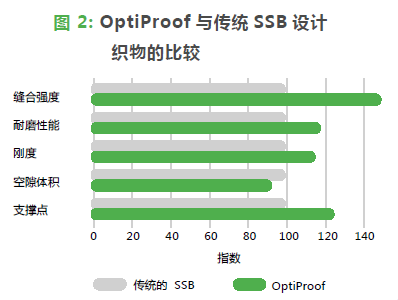 与传统的单边带成形织物相比,OptiProof成形织物纤维支撑更好,提高了25%;更高的CMD刚度,提高了15%。与传统的单边带成形织物相比,虽然OptiProof成形织物较薄,并且空隙体积低了近10%,但其耐磨性能更好,几乎提高了20%;接缝强度也更高,提高了5%(见图2),这主要是由于采用了锁式缝合。