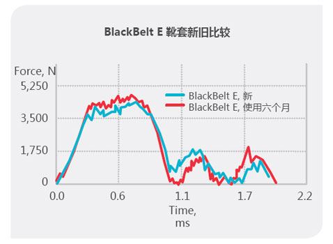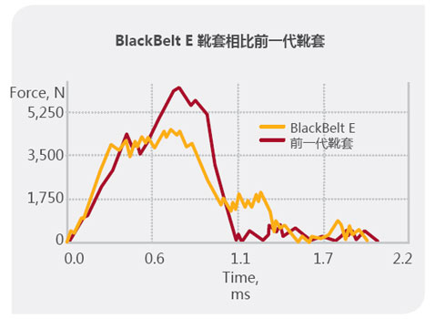 靴套与前一代靴受力曲曲的对比。以同样的方便冲击冲击e e e e,冲击冲击量对blackbelt损伤。较少对blackbelt。完整。