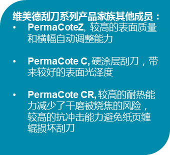 维美德最近投产的PermaCote C合金刮刀,采用最新的纳米级粉末喷涂技术,具有较好的微观结构,提高了耐磨性,降低了产生微裂的趋势并显著延长了使用寿命。即使在磨损的情况下这种纳米碳化物的合金刮刀同样会带来极佳的涂布效果。由于使用寿命长,延长了刮刀的更换周期,减少了停机时间和刮刀库存。